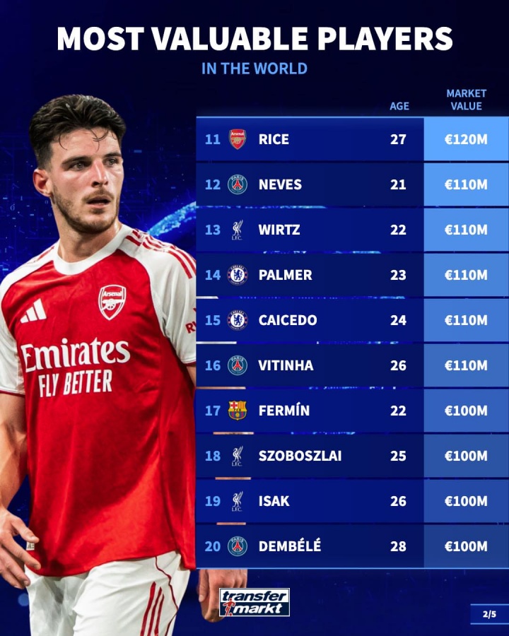 11-赖斯(阿森纳),27岁,1.2亿欧